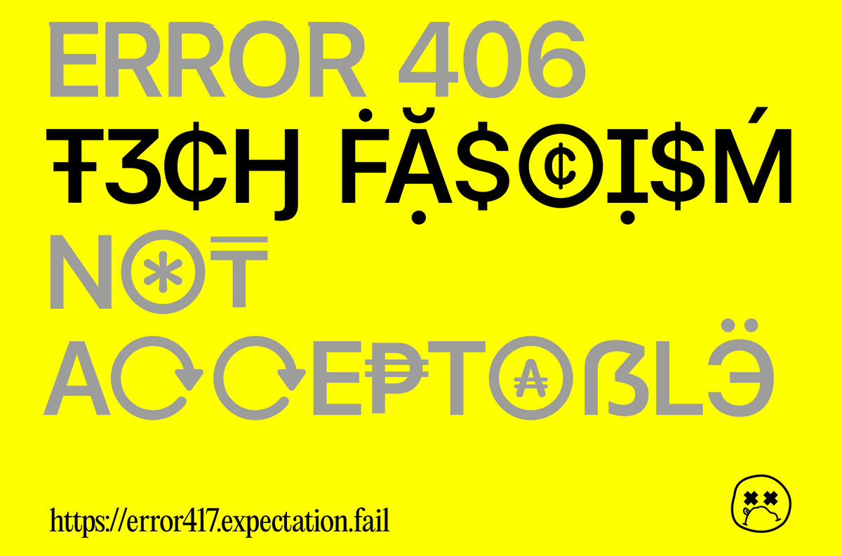 The exhibition presents 13 projects selected by the jury Hito Steyerl, Nora O’ Murchú and Sam Lavigne, through the open call Error 406 [Tech Fascism] Not Acceptable, initiated by Error 417 Expectation Failed in 2025.