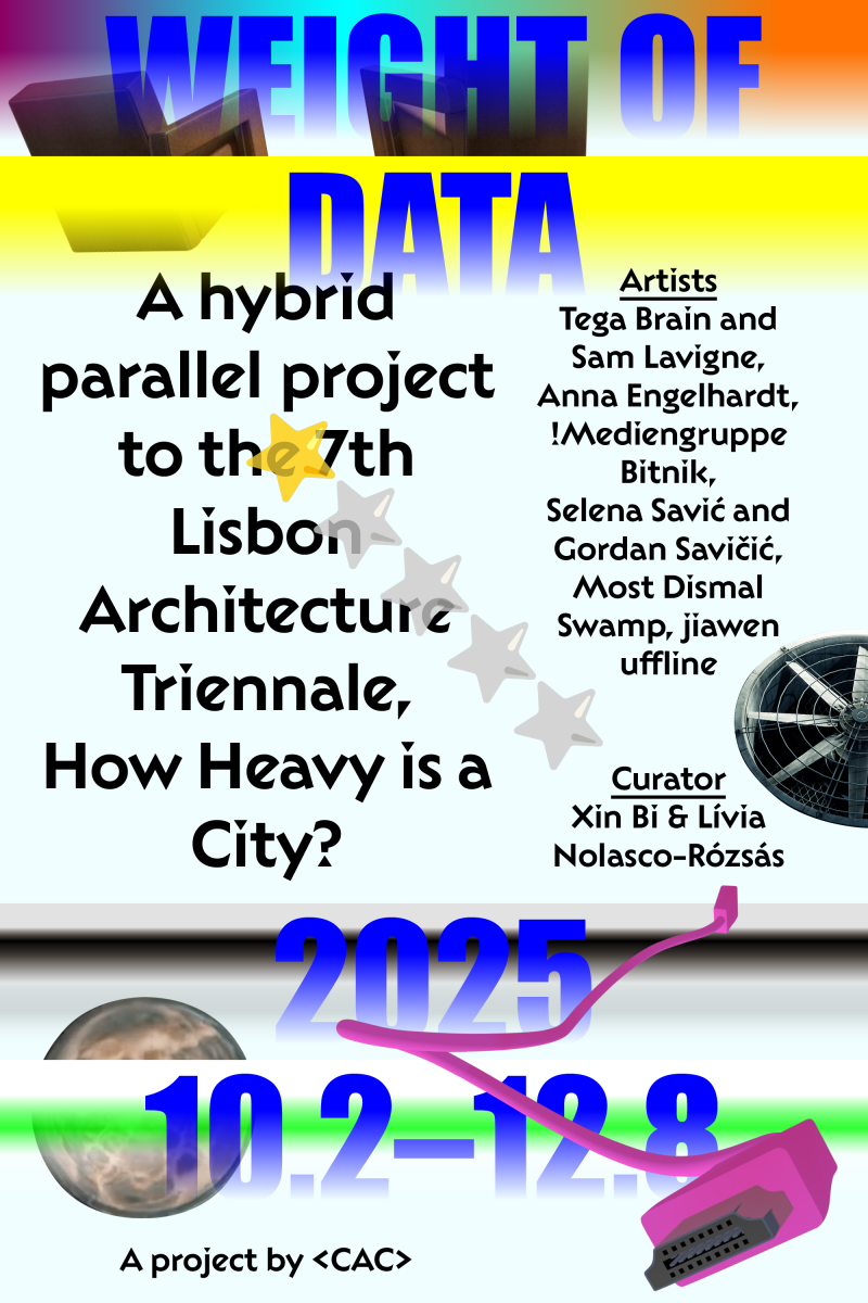 Weight of Data is a hybrid exhibition exploring the speculative presence and spectral materiality of digital objects in shaping urban landscapes via five recent digital art projects. As smart cities appear lighter and more frictionless, they mask the hidden weight of wireless waves, algorithmic governance, and extractive infrastructures. The works trace how these invisible forces haunt urban space—shaping perceptions, emotions, and decisions—while entangling online and offline realms. This parallel project to the 7th Lisbon Architecture Triennale is realized with the support of Chronus Art Center (Shanghai) and curated by Milia Xin Bi and Lívia Nolasco-Rózsás.